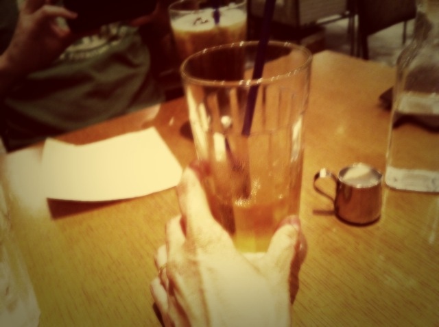 只今、カフェにて会議中。